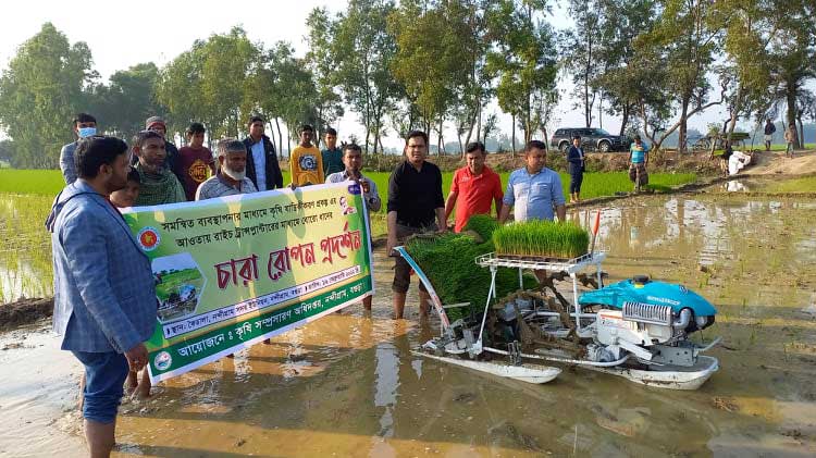 শস্যভান্ডার হিসেবে খ্যাত বগুড়ার নন্দীগ্রামে দিনকে দিন আধুনিক প্রুযুক্তির ছোঁয়ায় বদলে যাচ্ছে নন্দীগ্রামের কৃষি ও কৃষক। এক সময় মানুষেই ভরসা ছিলো জমিতে চারা রোপনের জন্য। কিন্তু বর্তমানে আধুনিক প্রযুক্তির বদলৌতে সেখান থেকে বেরিয়ে এসে মানুষ ঝুঁকছে যন্ত্রের দিকে। যন্ত্রের মাধ্যমে জমিতে চারা রোপন করতে সময়,খরচ ও শ্রম কম লাগে। এতে করে খুব সহজে মানুষ জমিতে চারা রোপন করতে পারছে। চারা লাগানোর আধুনিক যন্ত্র রাইস ট্রান্সপ্লান্টারের মাধ্যমে ধানের চারা লাগানো হলো নন্দীগ্রামের কৈডালা গ্রামের মাঠে। গত বুধবার দুপুর ১২ টার দিকে উপজেলা কৃষি অফিসের তত্ত্বাবধায়নে রাইস ট্রান্সপ্লান্টারের মাধ্যমে ধানের চারা লাগানোর প্রযুক্তি প্রদর্শন করা হয়। ট্রেতে বিশেষ প্রযুক্তিতে চারা উৎপাদন করে সেই চারা লাগানো হয় এই যন্ত্রের মাধ্যমে। রাইস ট্রান্সপ্লান্টারের মাধ্যমে ধানের চারা লাগানো হলে সময়, শ্রম এবং অর্থ কম লাগে। কৃষকদেরকে উৎসাহ দেয়ার জন্য এই যান্ত্রিক প্রযুক্তি প্রদর্শনের আয়োজন করা হয় । এই প্রযুক্তিটি দেখতে আশেপাশের দূর-দূরান্তের কৃষক-কৃষাণীদের ব্যাপক উপস্থিতি লক্ষ্য করা যায় এবং ক্রমেই ভীড় বাড়তে থাকে। উপজেলা কৃষি অফিসের পক্ষ থেকে উপস্থিত কৃষকদেরকে যন্ত্রের নানা সুবিধা ও কলা কৌশল নিয়ে ব্রিফিং দিতে দেখা যায়। যন্ত্রটি চলাকালে মুগ্ধ হয়ে তাকিয়ে থাকেন এলাকার কৃষক-কৃষানী। কৃষক মোঃ লতিফ বলেন এই যন্ত্র আগে আসলি কত ভালোই হইতো। উপজেলা কৃষি অফিসার মোঃ আদনান বাবু জানান, ধানের চারা লাগানোর একটি আধুনিক এবং যুগোপযোগী যন্ত্র হলো রাইস ট্রান্সপ্লান্টার। এক বিঘা জমিতে ধানের চারা লাগাতে মাত্র পঞ্চাশ মিনিট সময় লাগে। জ¦ালানী লাগে মাত্র সত্তর টাকার। খুব অল্প সময়ে, কম পরিশ্রমে ধানের চারা লাগানো যায়। নন্দীগ্রামের কৃষকদের মাঝে ব্যপক উৎসাহ উদ্দীপনা লক্ষ্য করা যাচ্ছে। বর্তমান কৃষিবান্ধব সরকার কৃষকদের সুবিধার্থে পঞ্চাশ ভাগ ভর্তুকি মূল্যে এই সকল যন্ত্র কৃষকদের মাঝে সরবরাহ করছে। আগামীদিনের কৃষিতে যান্ত্রিকীকরণের কোন বিকল্প নেই।