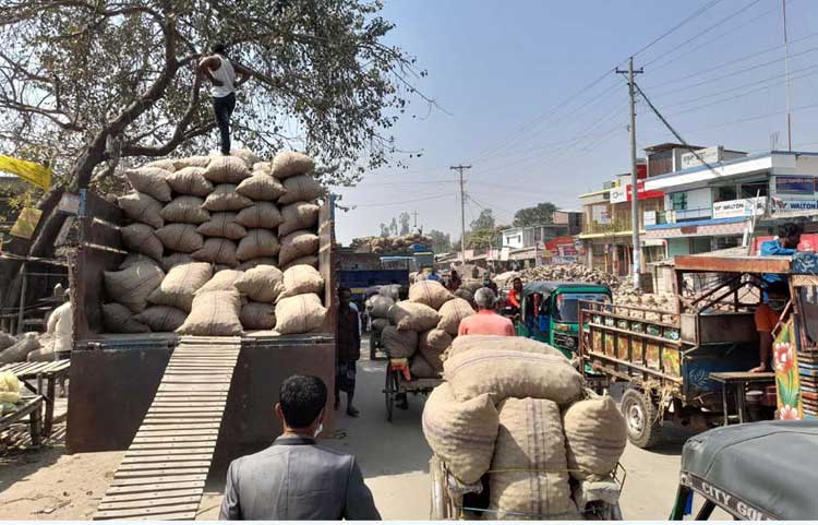 বগুড়ার শিবগঞ্জ উপজেলার কিচক ইউনিয়নের কিচক বাস ষ্ট্যান্ডের অদুরে মহাসড়কে উপর আলুর হাট বসায় দীর্ঘ যানজট যাত্রীদের চরম ভোগান্তি।