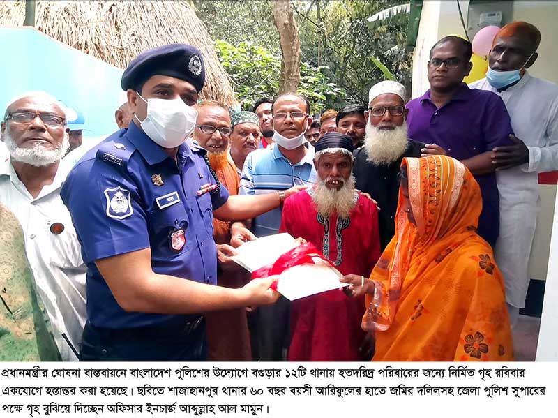 হামার বাপ-মাও মানুষের দুয়ারে দিনমজুরি করে কোনমতে জীবনডাক বাঁচায় রাখছিলো স্যার, ছিলোনা কোন মাথা গোঁজার ঠাঁই! কিন্তু আজ প্রধানমন্ত্রী শেখ হাসিনা আর পুলিশ স্যারেরা হামার মাও বাপেক একটা আশ্রয় দিলো যা হামরা সন্তানেরা দারিদ্রতার জন্যে করব্যার পারি নি। আল্লাহ পুলিশের ভাল করুক, আর শেখ হাসিনাক অনেকদিন বাঁচায় রাখুক.... অন্তর থেকে এমনই অনুভূতি প্রকাশ করছিলো বাংলাদেশ পুলিশের উদ্যোগে বগুড়া জেলা পুলিশের ব্যবস্থাপনায় জমিসহ বাড়ি পাওয়া বগুড়ার শাজাহানপুর থানার চুপিনগর ইউনিয়নের দিনমজুর আরিফুল ইসলাম ও সাহেরা’র মেয়ে টপি খাতুন। আর থানার ওসি আব্দুল্লাহ আল মামুন যখন বাংলাদেশ পুলিশের পক্ষে তাদের ফুলের শুভেচ্ছা জানিয়ে দলিল তুলে দিলেন তখন জীবনে প্রথম নিজের বাড়িতে উঠবে এই খুশিতে অশ্রুসিক্ত চোখে নির্বাক হয়ে দাঁড়িয়ে ছিল বাড়ি পাওয়া দিনমজুর আরিফুল। আরিফুলের মতো এমন হৃদয়স্পর্শী দৃশ্য দেখা গেছে বগুড়া জেলার বাকি থানাগুলোতেও।
