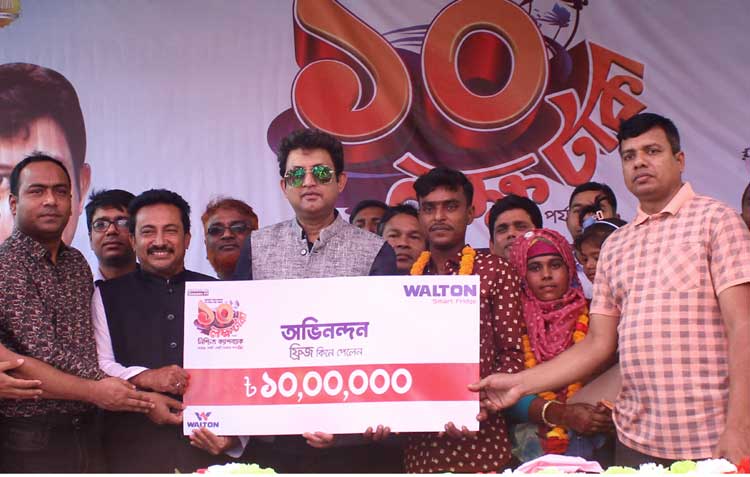 বগুড়ার নন্দীগ্রামে জুয়েল হোসেন নামের এক ভ্যান চালককে ১০ লাখ টাকার চেক দিয়েছেন চিত্রনায়ক আমিন খান। নাটোর জেলার সিংড়া উপজেলার শতকুড়ি গ্রামের ওই ভ্যানচালক ওয়ালটনের নন্দীগ্রাম শোরুম থেকে ২৯ হাজার ৭৯০ টাকায় একটি ফ্রিজ কিনে প্রথম পুরস্কার জিতেছেন। গতকাল শনিবার দুপুরে পৌর সদরে উপজেলা খাদ্য গুদাম চত্বরে আয়োজিত অনুষ্ঠানে ভ্যানচালক জুয়েল হোসেনের হাতে ১০ লাখ টাকার চেক তুলে দেন ওয়ালটন গ্রুপের সিনিয়র এক্সিকিউটিভ ডিরেক্টর চিত্রনায়ক আমিন খান। এসময় ওই ভ্যান চালক আবেগাপ্লুত ছিলেন। চেক প্রদান অনুষ্ঠানে উপস্থিত ছিলেন উপজেলা পরিষদের চেয়ারম্যান রেজাউল আশরাফ জিন্নাহ, থানার অফিসার ইনচার্জ (ওসি) আনোয়ার হোসেন সহ ওয়ালটনের কর্মকর্তাবৃন্দ।