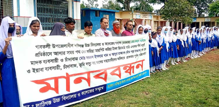 বগুড়া গাবতলীর লাঠিগঞ্জ স্কুল এন্ড কলেজের অধ্যক্ষ (ভারপ্রাপ্ত) রুস্তম আলীকে এলাকার সন্ত্রাসী কর্তৃক মারপিট ও টাকা ছিনতাইয়ের ঘটনায় দোষীদের শাস্তির দাবীতে মানববন্ধন করা হয়েছে। অত্র স্কুল এন্ড কলেজের শিক্ষক, কর্মচারী, ছাত্রছাত্রী ও অভিভাবকবৃন্দের ব্যানারে গতকাল শনিবার কলেজ মাঠে এই মানববন্ধন করা হয়। মানববন্ধনে বক্তব্য রাখেন লাঠিগঞ্জ স্কুল এন্ড কলেজের এডহক কমিটির সভাপতি ও উপজেলা আওয়ামী লীগের সাবেক সাংগঠনিক সম্পাদক মোমিনুল হক শিলু, কলেজের অধ্যক্ষ (ভারপ্রাপ্ত) রুস্তম আলী, এডহক কমিটির সদস্য মতিউর রহমান মিলন, শিক্ষার্থী রুমান ও ফারজানা প্রমুখ। মানববন্ধনে বক্তারা বলেন, শিক্ষক হলো মানুষ গড়ার কারিগর। এই কারিগরদের মারপিট ও কলেজের উন্নয়নের টাকা ছিনতাই এটা কোনভাবেই মেনে নেওয়া যায় না। তাই দ্রুত তদন্তপূর্বক চিহিৃত এই সন্ত্রাসীদের আইনের আওতায় এনে শাস্তির দাবী জানান বক্তারা। মানববন্ধনে অভিভাবক সদস্য ও ছাত্রছাত্রীরা অংশ গ্রহণ করলেও প্রতিষ্ঠানের শিক্ষকরা অংশ গ্রহণ করেননি। এ ব্যাপারে কলেজের অধ্যক্ষ (ভারপ্রাপ্ত) রুস্তম আলী স্থানীয় সাংবাদিকদের বলেন, ওই হামলাকারী সন্ত্রাসীরা শিক্ষকদের বিভিন্নভাবে ভয়ভীতি দেখাচ্ছে। মূলত সেকারণেই শিক্ষকরা ভয়ে মানববন্ধনে অংশ গ্রহণ করতে পারেনি। এলাকায় শান্তিপূর্ণ পরিবেশ বজায় রাখতে মানববন্ধনস্থলে থানার ওসি সিরাজুল ইসলাম সিরাজ, ওসি তদন্ত জামিরুল ইসলামসহ সঙ্গীয় ফোর্স উপস্থিত ছিলেন।