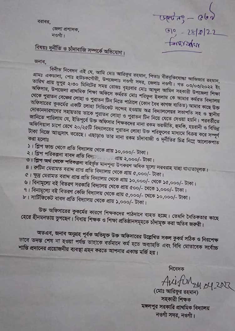 খোঁজ নিয়ে জানা গেছে, জেলার মহাদেবপুর উপজেলার উত্তরগ্রাম ইউনিয়নের বাসিন্দা আব্দুল আমিন ২০১৮ সালের সেপ্টেম্বর মাসে নওগাঁ সদর উপজেলা শিক্ষা অফিসে সহকারী উপজেলা শিক্ষা অফিসার হিসেবে যোগদান করেন। এর আগেও তিনি বিভিন্ন উপজেলায় সহকারী উপজেলা শিক্ষা অফিসার হিসেবে কর্মরত ছিলেন। সদর উপজেলায় যোগদানের পর থেকেই তিনি জড়িয়ে পড়েন নানাবিধ অপকর্মে। বিভিন্ন বিদ্যালয়ের উন্নয়ন কাজে আসা বরাদ্দের প্রতিটা খাত থেকেই উৎকোচ নিতে শুরু করেন তিনি। গত ২৪ এপ্রিল আব্দুল আমিন এর বিরুদ্ধে দুর্নীতি ও চাঁদাবাজির অভিযোগ এনে জেলা প্রশাসক বরাবর লিখিত অভিযোগ দেন সদর উপজেলার মঙ্গলপুর সরকারি প্রাথমিক বিদ্যালয়ের সহকারী শিক্ষক আরিফুর রহমান। তাৎক্ষণিক অভিযোগ ক্ষতিয়ে দেখতে একটি তদন্ত কমিটি গঠন করে দেন জেলা প্রশাসক। তবে অভিযোগের ৫ মাস পেরিয়ে গেলেও অজানা কারণে এখনো সেই তদন্ত প্রতিবেদন জমা দেয়া হয়নি। শিক্ষা কর্মকর্তাদের সাথে সখ্যতা থাকার সুবাদে আব্দুল আমিনের বিরুদ্ধে আনা এই অভিযোগের তদন্ত পিছিয়েছে বলে অভিযোগ রয়েছে। এরই মধ্যে চলতি বছর জেলায় জাতীয় প্রাথমিক শিক্ষা পদক দিতে শ্রেষ্ঠ তালিকায় উপজেলা যাচাই বাঁছাই কমিটি আব্দুল আমিনের নাম সুপারিশ করেছে। শিক্ষা কর্মকর্তার সাথে সখ্যতার কারণে যাচাই বাছাই কমিটির সামনে তার দোষগুলো তুলে ধরা হয়নি বলে অভিযোগ রয়েছে। শ্রেষ্ঠ ঘোষণার আগেই তার নাম সুপারিশের খবরটি চারিদিকে ছড়িয়ে পড়লে ক্ষোভে ফুলে ফেঁপে উঠেছেন জেলার বিভিন্ন প্রতিষ্ঠানের শিক্ষকরা।