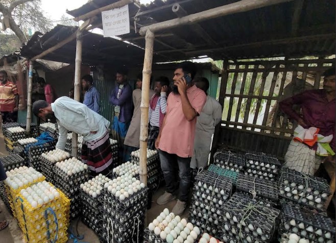 ডিমের পাইকার শহিদুল জানান,বেচাকেনা কম, আমদানি বেশি,গরম পরতেছে,মানুষ খাচ্ছে কম এই জন্য ডিমের দাম কম। তবে আশা করছি অল্প দিনের মধ্যে এ বাজার থাকবে না। আগের দামে ডিম বিক্রি হবে।
